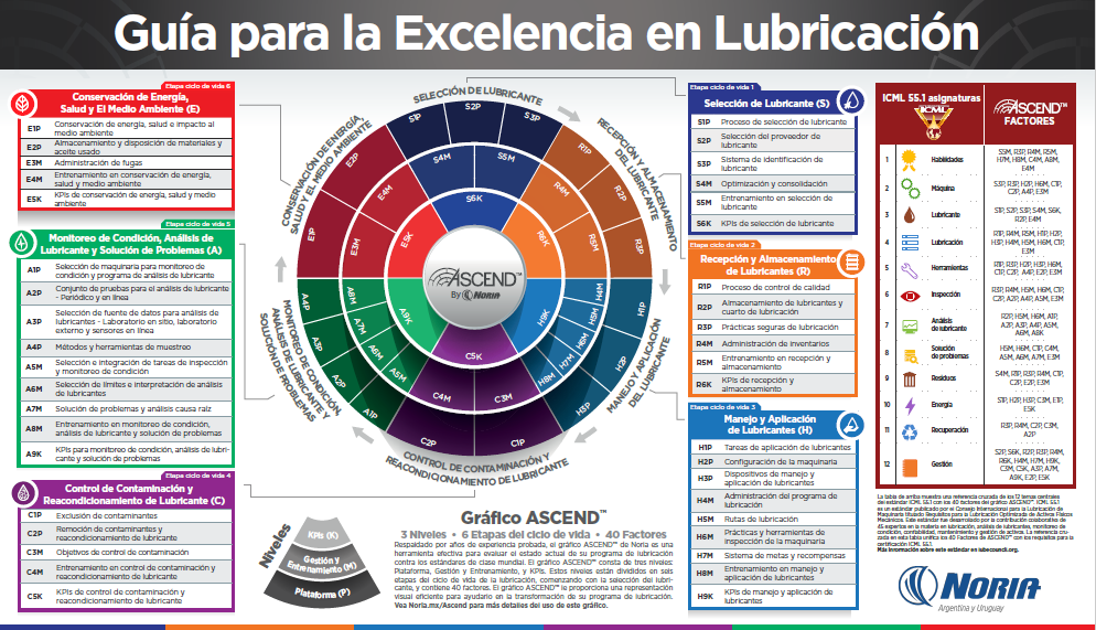El Gráfico Ascend fue creado para proporcionar un marco útil o una guía para la implementación de una estrategia de mantenimiento proactivo en lubricación. Consta de seis etapas del ciclo de vida del lubricante, siguiendo en sentido horario comenzando desde la parte superior. Dentro de cada etapa hay oportunidades específicas de “cambio y control”