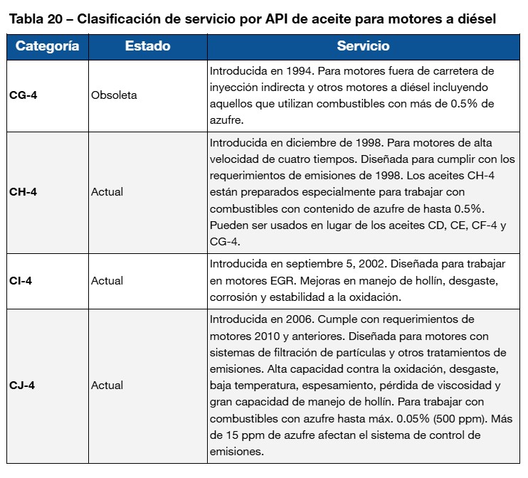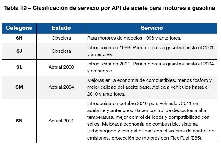 Mención aparte para los aceites usados en motores de combustión interna a gasolina y diésel, y para los de transmisiones manuales y diferenciales, los cuales son clasificados de acuerdo a los estándares establecidos por el API (American Petroleum Institute) y por la ACEA (European Automobile Manufacturers Association) y para los aceites utilizados en transmisiones manuales (desempeño definido por los fabricantes de equipos). En la clasificación de estos lubricantes se utilizarán los símbolos establecidos en las normas correspondientes (tablas 19 a 21).